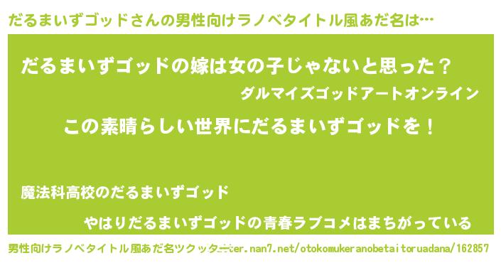| 女子向けラノベタイトル風あだ名 | 『乙女ゲームの破滅フラグしかない悪役だるまいずゴッドに転生してしまった…』 |