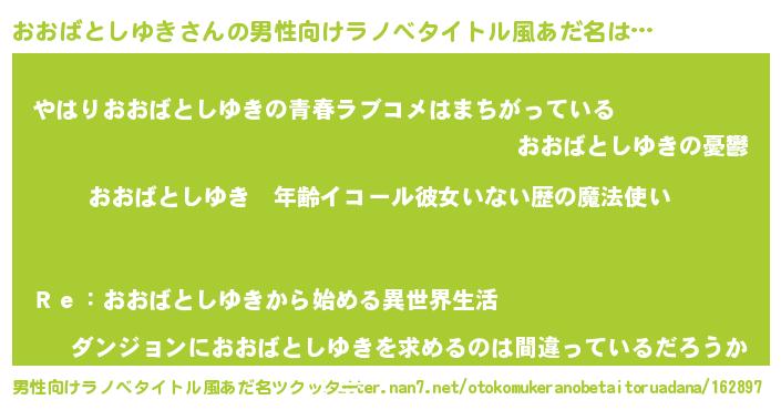 | 女子向けラノベタイトル風あだ名 | 『おおばとしゆきの玉の輿計画!』 |