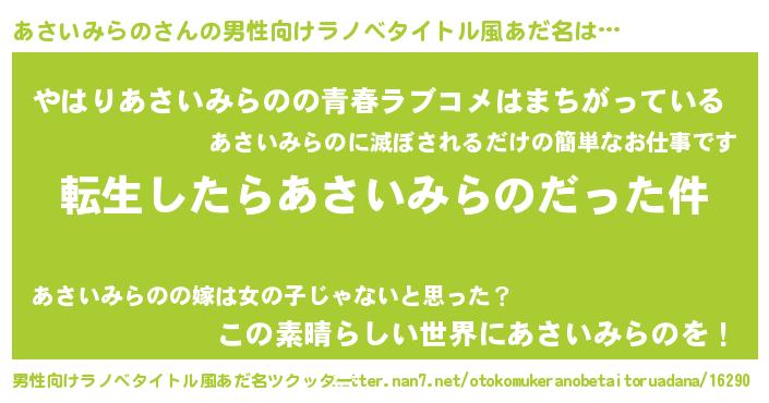 | 女子向けラノベタイトル風あだ名 | 『婚約破棄系悪役あさいみらのに転生したので、保身に走りました。』 |
