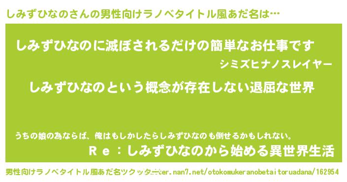 | 女子向けラノベタイトル風あだ名 | 『しみずひなのの契約王妃』 |