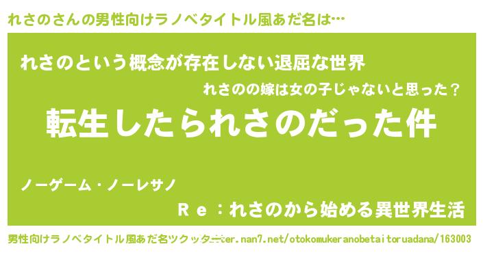 | 胡散臭い通販商品みたいなあだ名 | 『来世でも幸せになれる健康食品…その名も「れさの」』 |