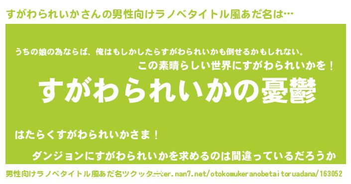 | 女子向けラノベタイトル風あだ名 | 『(仮)すがわられいかのやんごとなき事情』 |