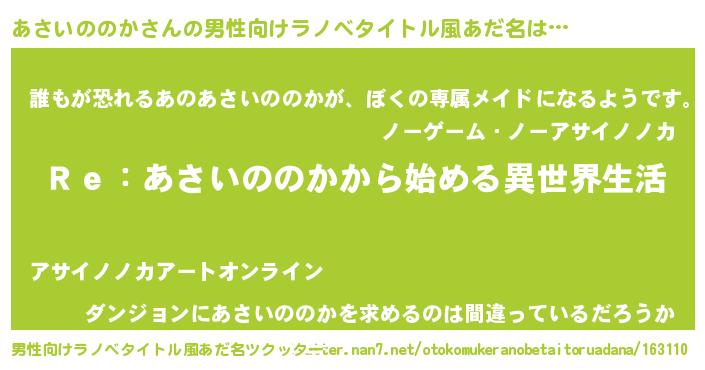 | 女子向けラノベタイトル風あだ名 | 『あさいののかストレイドッグス』 |