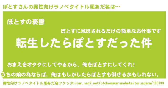 | 女子向けラノベタイトル風あだ名 | 『ぽとすの玉の輿計画!』 |