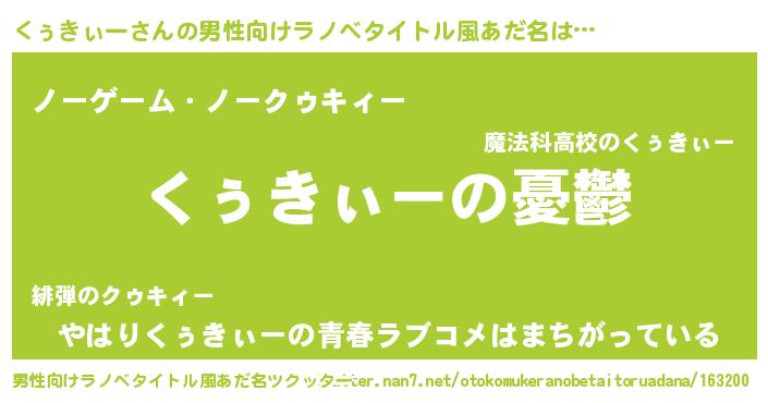 | 女子向けラノベタイトル風あだ名 | 『(仮)くぅきぃーのやんごとなき事情』 |