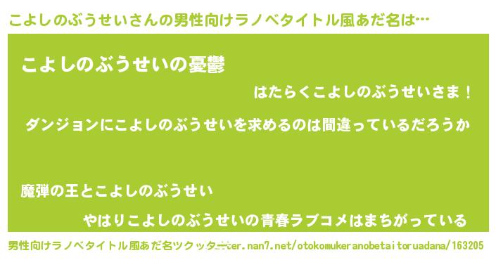 | 女子向けラノベタイトル風あだ名 | 『こよしのぶうせいの卵を拾いまして』 |