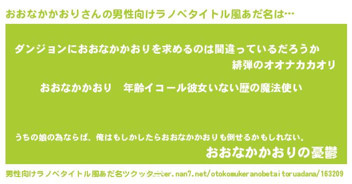 | 女子向けラノベタイトル風あだ名 | 『おおなかかおりの玉の輿計画!』 |