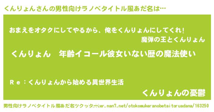 | 女子向けラノベタイトル風あだ名 | 『くんりょんの玉の輿計画!』 |