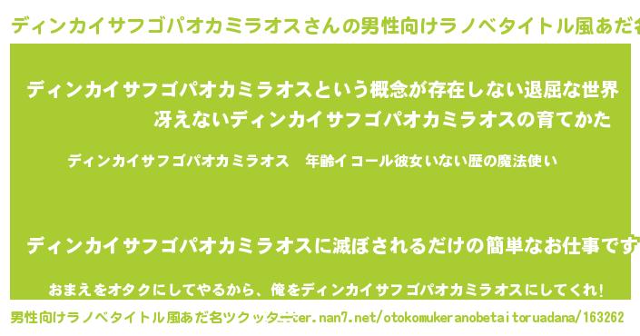 | 女子向けラノベタイトル風あだ名 | 『ディンカイサフゴパオカミラオスの玉の輿計画!』 |
