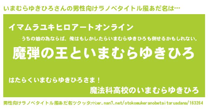 | 女子向けラノベタイトル風あだ名 | 『乙女ゲームの破滅フラグしかない悪役いまむらゆきひろに転生してしまった…』 |