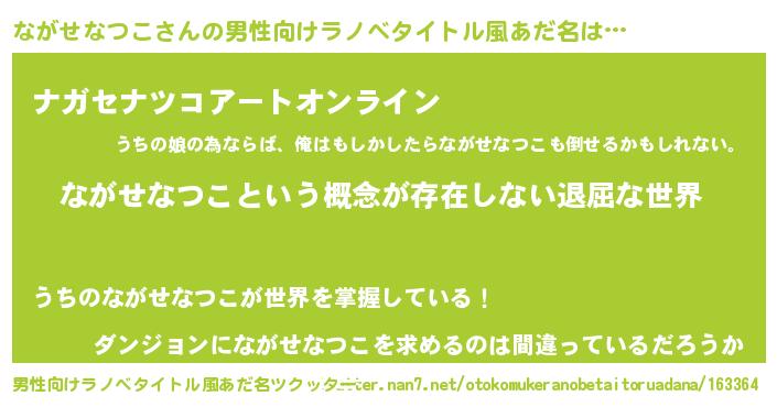 | 女子向けラノベタイトル風あだ名 | 『異世界で失敗しない100のながせなつこ』 |