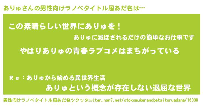| 女子向けラノベタイトル風あだ名 | 『ありゅの雑貨屋さん』『闇のありゅ』 |