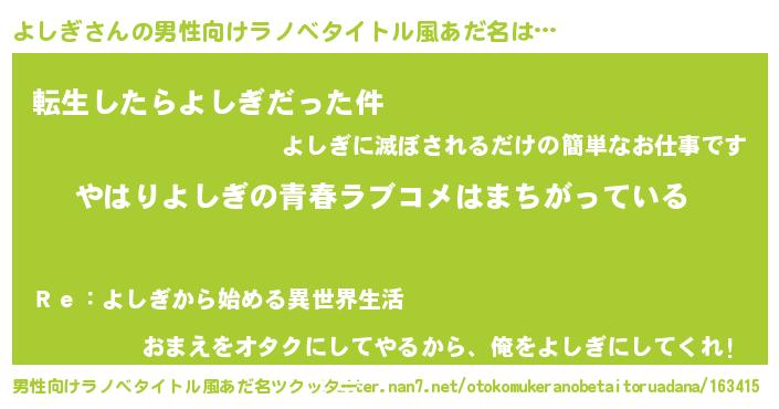 | 女子向けラノベタイトル風あだ名 | 『よしぎの雑貨屋さん』『よしぎ恋絵巻』 |