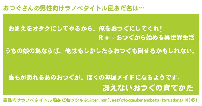 | 女子向けラノベタイトル風あだ名 | 『おつぐ伯爵の花嫁』『おつぐ恋絵巻』 |