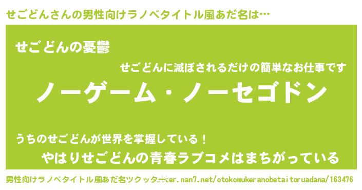 | 女子向けラノベタイトル風あだ名 | 『死神せごどんの再婚』 |