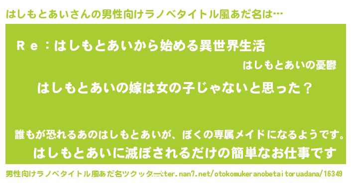 | 女子向けラノベタイトル風あだ名 | 『はしもとあいの卵を拾いまして』 |