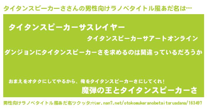 | 女子向けラノベタイトル風あだ名 | 『タイタンスピーカーさの卵を拾いまして』 |