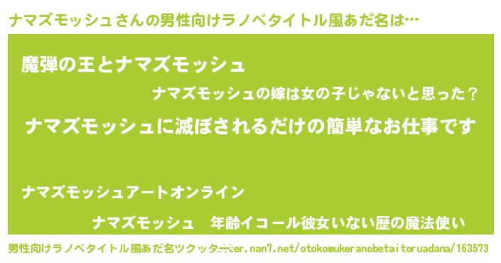 | 女子向けラノベタイトル風あだ名 | 『横柄ナマズモッシュと宰相陛下』 |
