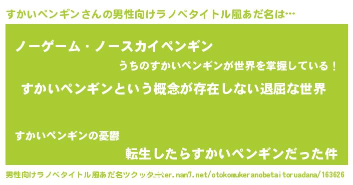 | 女子向けラノベタイトル風あだ名 | 『異世界で失敗しない100のすかいペンギン』 |