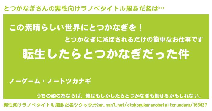 | 胡散臭い通販商品みたいなあだ名 | 『世界中を虜にした100年もののヴィンテージワイン…その名も「とつかなぎ」』 |