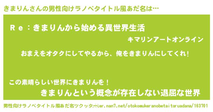 | 女子向けラノベタイトル風あだ名 | 『きまりん夫妻のなれそめ』 |