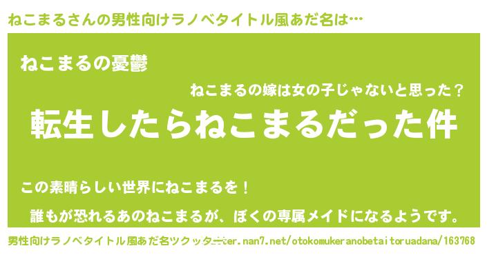 | 女子向けラノベタイトル風あだ名 | 『ねこまるの玉の輿計画!』 |