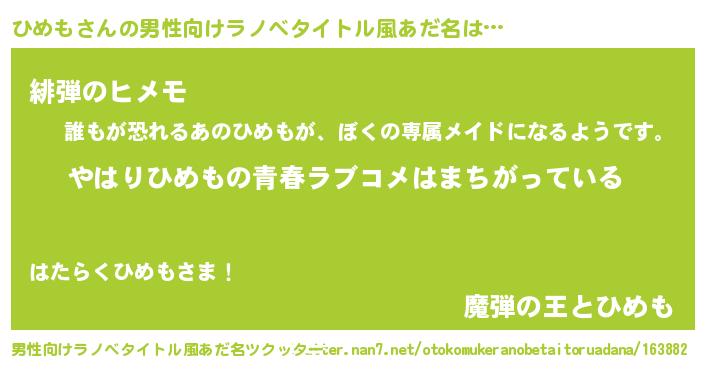 | 女子向けラノベタイトル風あだ名 | 『ひめも伯爵の花嫁』『ひめもの契約王妃』 |