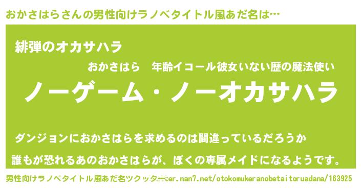 | 女子向けラノベタイトル風あだ名 | 『死神おかさはらの再婚』 |