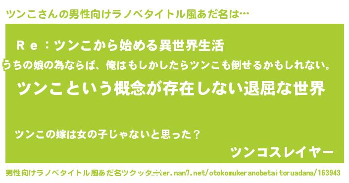 | 女子向けラノベタイトル風あだ名 | 『異世界で失敗しない100のツンこ』 |