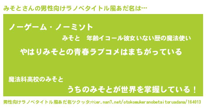 | 女子向けラノベタイトル風あだ名 | 『みそと伯爵の花嫁』『みそと恋絵巻』 |