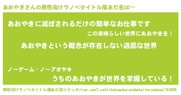 | 女子向けラノベタイトル風あだ名 | 『異世界で失敗しない100のあおやき』 |