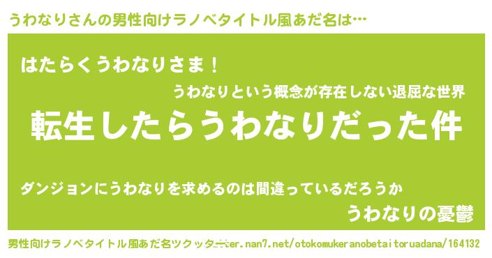 | 女子向けラノベタイトル風あだ名 | 『うわなりの玉の輿計画!』 |
