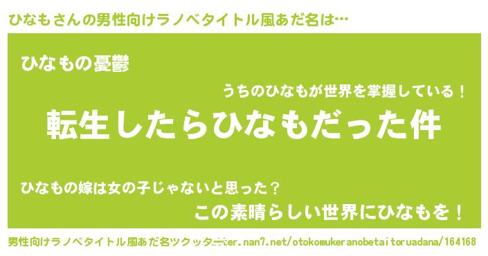| 女子向けラノベタイトル風あだ名 | 『婚約破棄系悪役ひなもに転生したので、保身に走りました。』 |