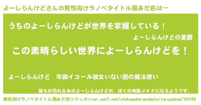 | 女子向けラノベタイトル風あだ名 | 『悪役よーしらんけどに転生したようですが、知った事ではありません』 |