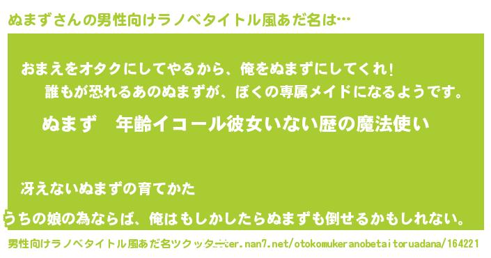 | 女子向けラノベタイトル風あだ名 | 『ぬまずの玉の輿計画!』『ぬまず恋絵巻』 |