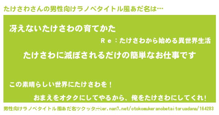 | 伝説のあだ名 | 『救世主となる錬金術士たけさわ』 |