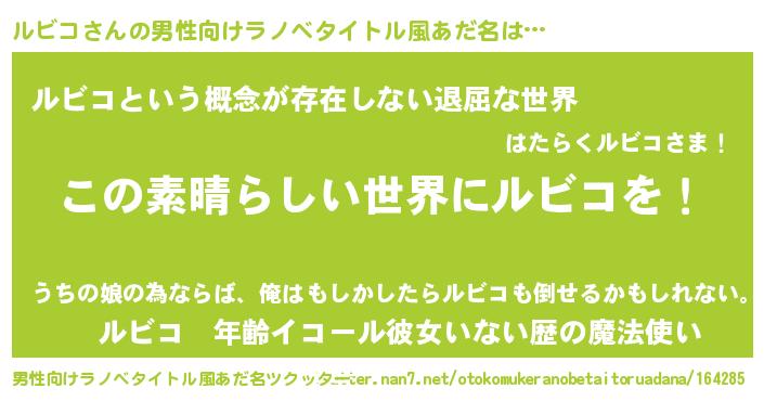 | 女子向けラノベタイトル風あだ名 | 『悪役ルビコに転生したようですが、知った事ではありません』 |