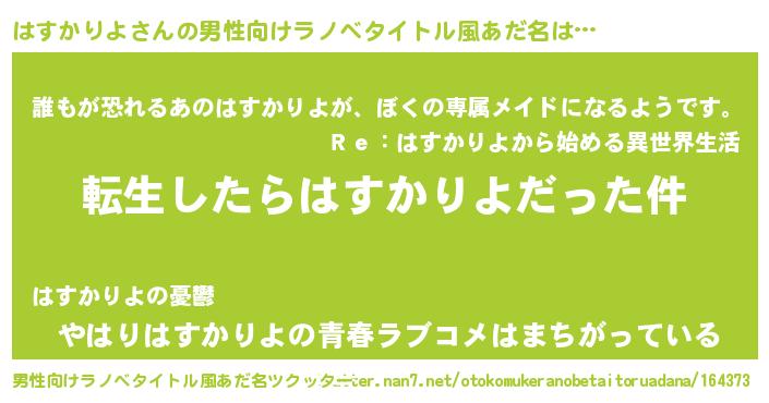 | 胡散臭い通販商品みたいなあだ名 | 『来世でも幸せになれる水素水…その名も「はすかりよ」』 |