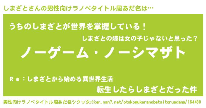 | 女子向けラノベタイトル風あだ名 | 『死神しまざとの再婚』『闇のしまざと』 |