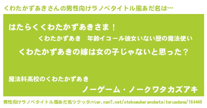 | 女子向けラノベタイトル風あだ名 | 『くわたかずあきの卵を拾いまして』 |