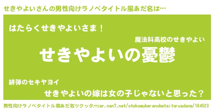 | 女子向けラノベタイトル風あだ名 | 『(仮)せきやよいのやんごとなき事情』 |
