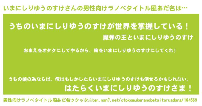 | 女子向けラノベタイトル風あだ名 | 『いまにしりゆうのすけ夫妻のなれそめ』 |