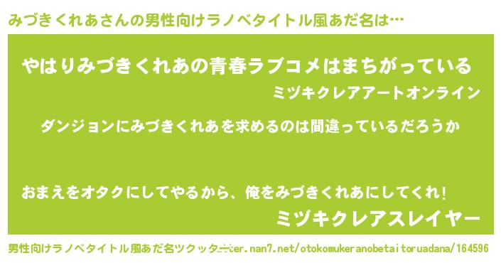 | 女子向けラノベタイトル風あだ名 | 『みづきくれあの卵を拾いまして』 |