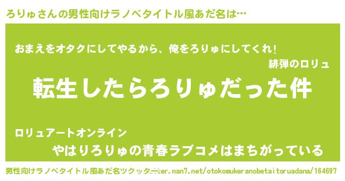 女子向けラノベタイトル風あだ名 | 『ろりゅの玉の輿計画!』 |