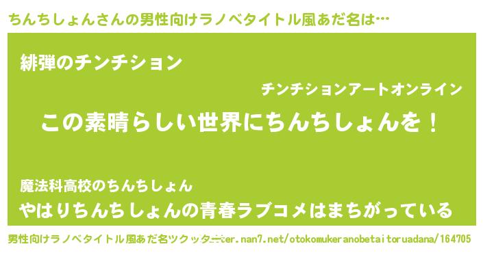 | 女子向けラノベタイトル風あだ名 | 『悪役ちんちしょんに転生したようですが、知った事ではありません』 |