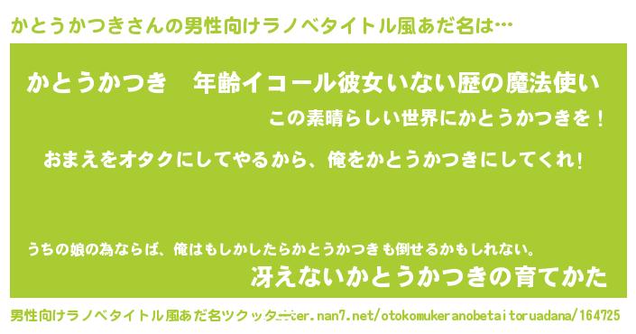 | 女子向けラノベタイトル風あだ名 | 『かとうかつき夫妻のなれそめ』 |