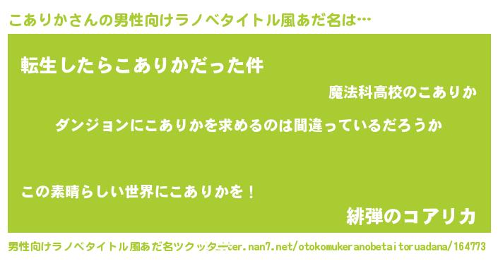 | 胡散臭い通販商品みたいなあだ名 | 『信頼と実績のサプリメント…その名も「こありか」』 |