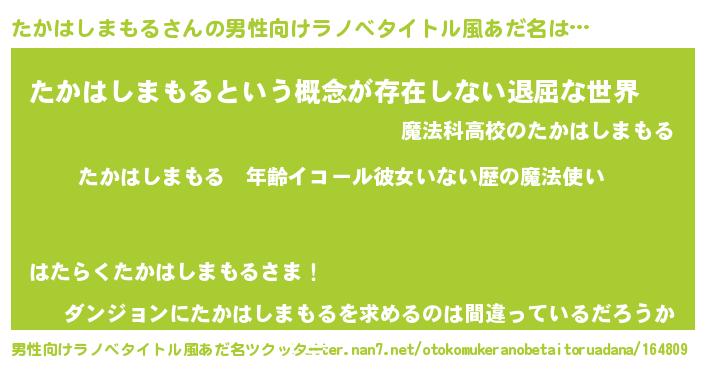 | 女子向けラノベタイトル風あだ名 | 『たかはしまもるの玉の輿計画!』 |