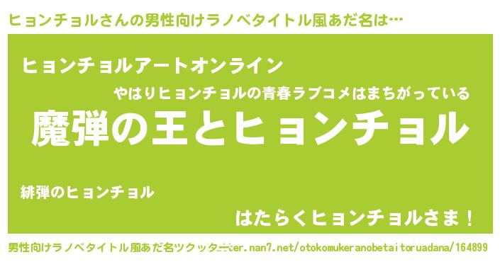 | 女子向けラノベタイトル風あだ名 | 『乙女ゲームの破滅フラグしかない悪役ヒョンチョルに転生してしまった…』 |