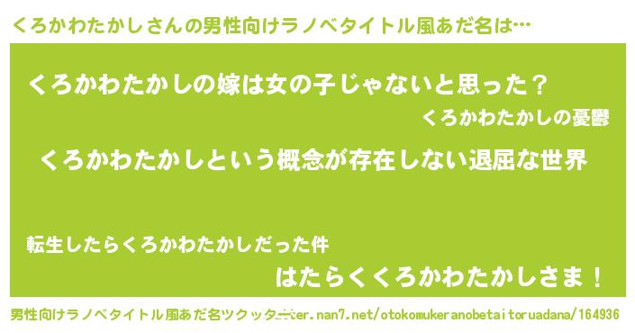 | 女子向けラノベタイトル風あだ名 | 『異世界で失敗しない100のくろかわたかし』 |